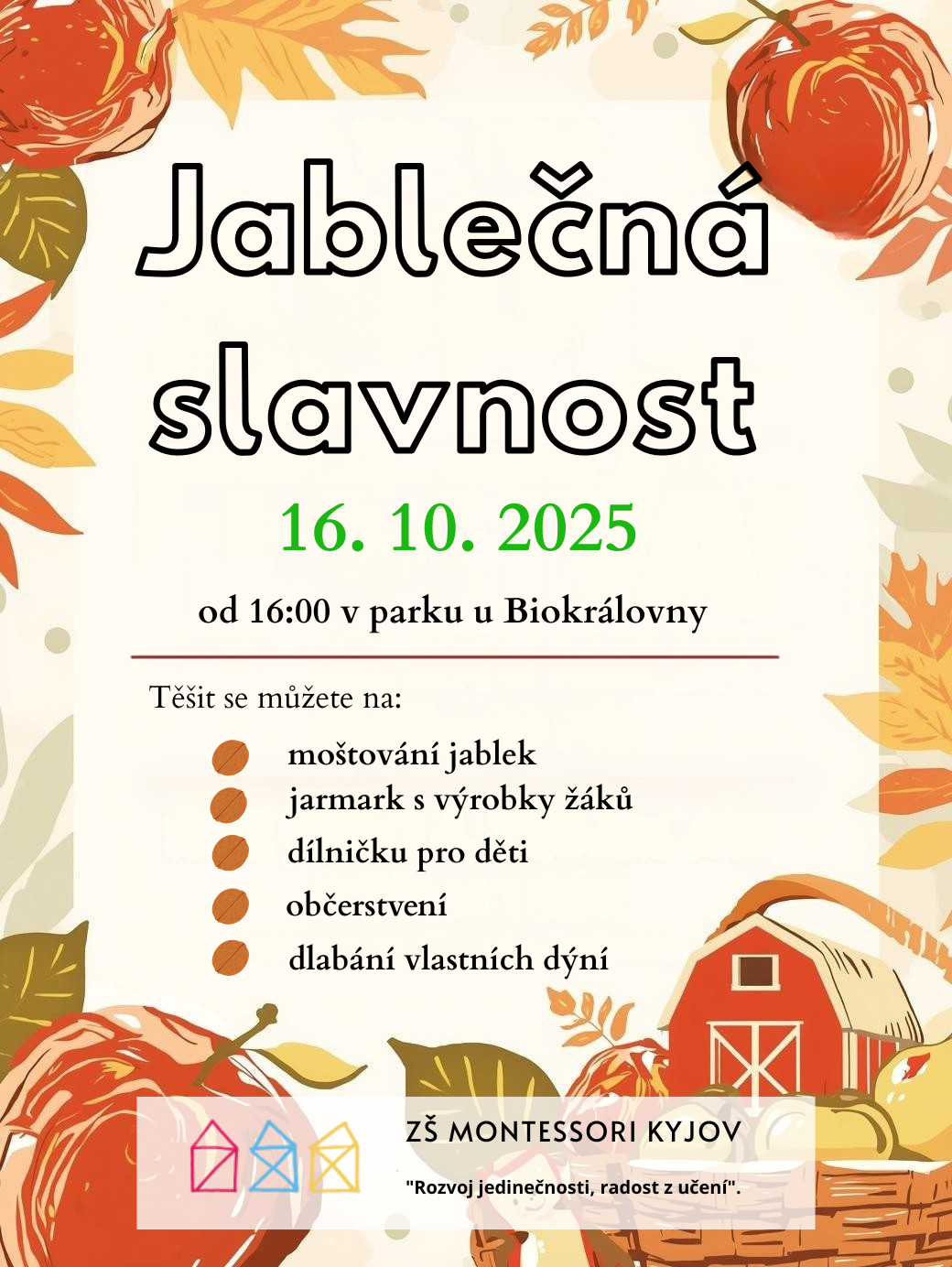 Zveme vás na oslavu podzimu a zejména jablíček! Těch se nám letos na školním pozemku urodilo požehnaně a naši žáci z nich zpracovali řadu výrobků, které budou k vidění či zakoupení na slavnosti. Nebudou chybět tvůrčí dílničky pro děti a dobroty slané i sladké, plánujeme také moštování. A dojde i na tradiční dlabání dýní!