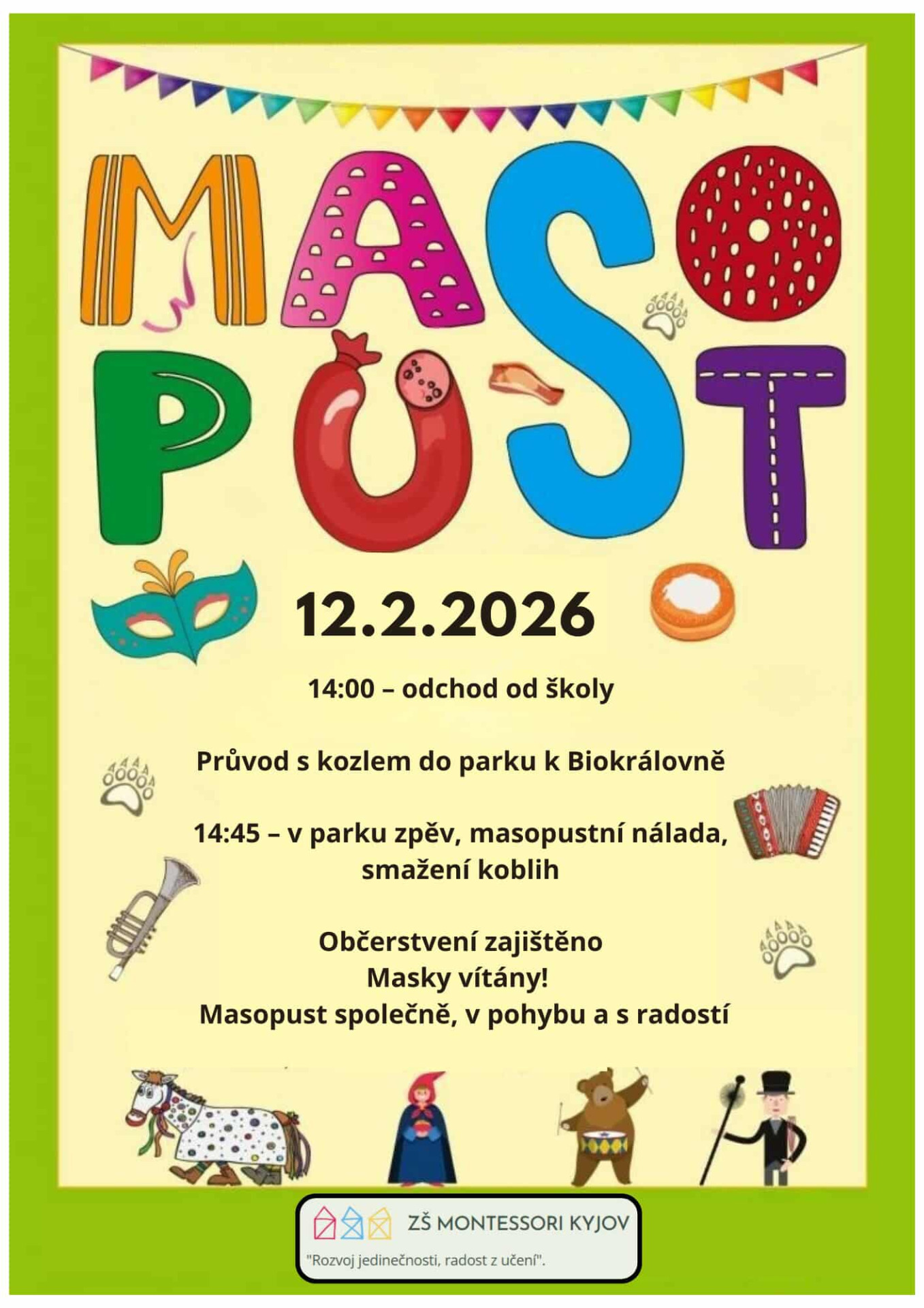 I letos se vydáme do parku v maskách a bujaré náladě; od školy vyrazíme v 14.00, poznáte nás podle zpěvu a podle toho, že si povedeme našeho školního kozla. V parku se sejdeme po půl třetí a bude tam na nás čekat zábava a tradiční občerstvení.